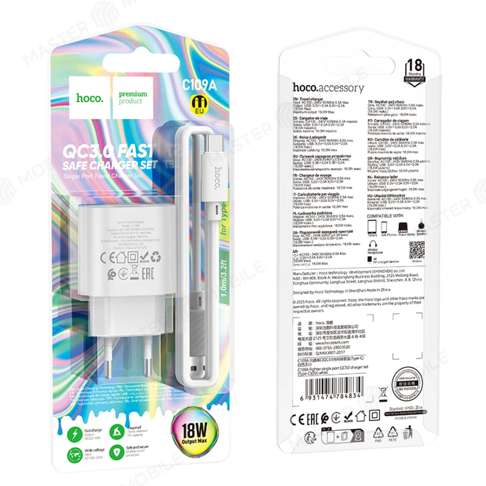 Сетевое зарядное устройство Hoco C109A USB 20W + кабель USB - TypeC (белый)