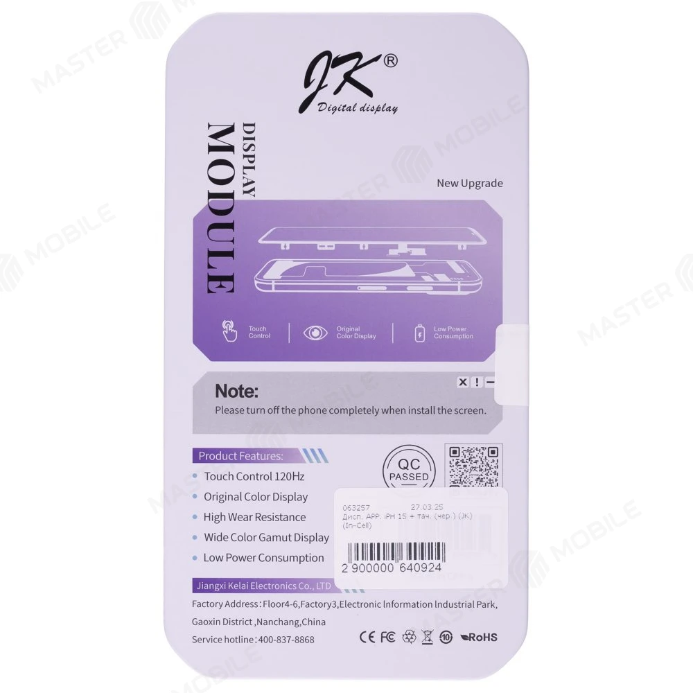 Дисплей для Apple iPhone 15 + тачскрин (черный) (JK) (In-Cell) (площадка под IC)