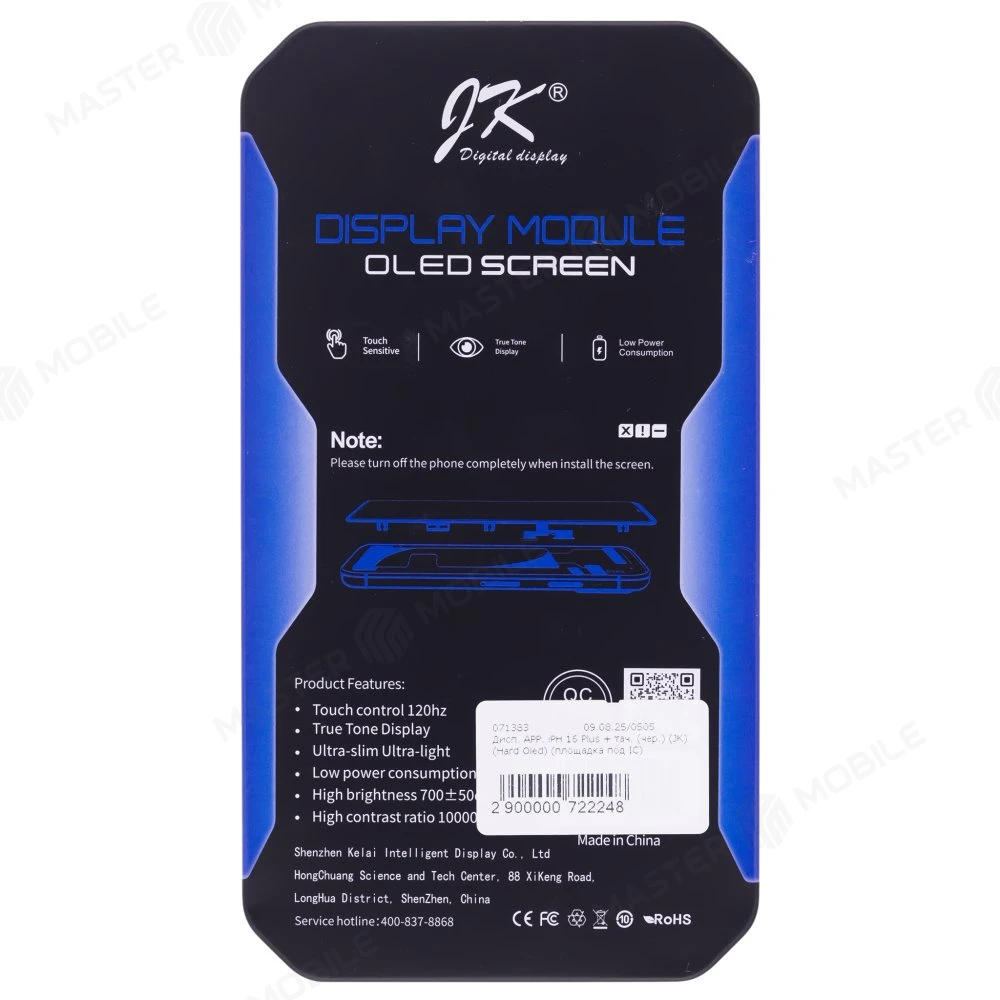 Характеристики Дисплей для Apple iPhone 16 Plus + тачскрин (черный) (JK) (Hard Oled) (площадка под IC)